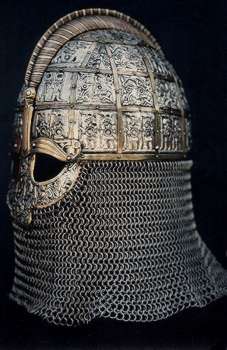 Thick leather was possibly used to make helmets although no leather helms have ever survived from the period. The technique of 'cuir bouilli' or scolding the leather to make it stiff and hard, has been suggested as an alternative for the iron plates inside the frame. Thick leather can be riveted successfully to the frame, however no-one has yet demonstrated that leather can substitute for the iron other than for glancing blows. The 'Benty Grange' helmet from Derbyshire although from an earlier period (approx. late 8th early 9th century AD) had horn plates either side and sandwiching it's iron frame. (Not quite as the replica in the Sheffield museum would suggest). It is also possible that basket work helms covered in hide or leather were used but, again, none have survived from our period (although there is an earlier Scandinavian find of a metal 'basketwork' skullcap which may have been worn over a soft covering). There is even some evidence for wooden helms!! How on earth these worked we can only guess.