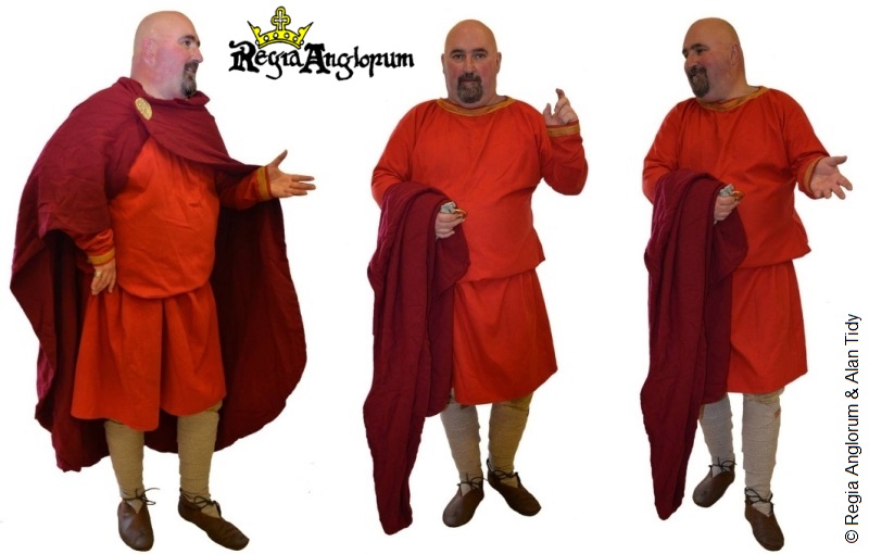 by Ted JonesThis Lord wears a madder dyed tunic and cloak. The neck and cuffs of his tunic are decorated in tablet weave and his cloak is closed with a large disc brooch.