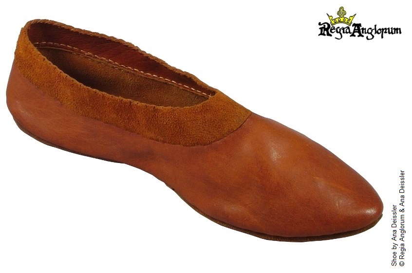 Shoes are of the simple, two-part turn shoe construction and are usually low, coming to below the ankle. Belongings can be carried in a shoulder bag of wool, linen or leather. A small drawstring pouch can be worn at the waist.