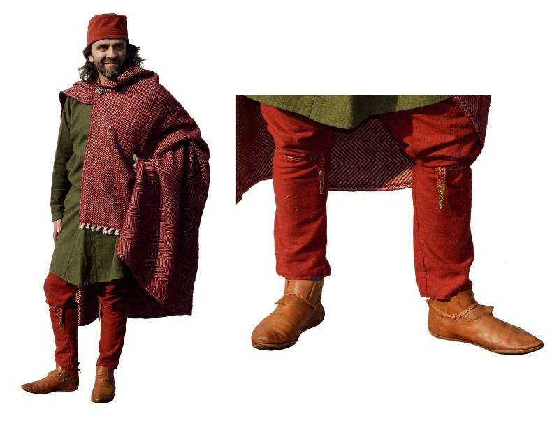 Leg coverings, if worn at all, should be tight to the leg and can be trousers or hose and braies. Leg wraps can also be worn. These are long strips of 10cm wide woollen cloth worn wound about the lower leg from the ankle to the knee.