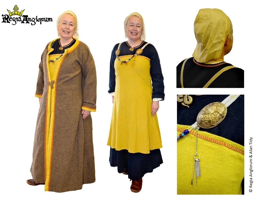 by Roland WilliamsonShe is wearing a yellow hangerock with type P37 oval brooches, gilded in gold. For warmth she has a long coat, closed by a single trefoil brooch and her hair is gathered up and covered with a simple cap.