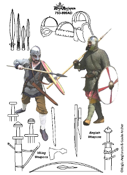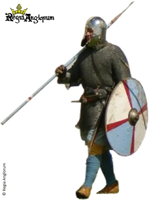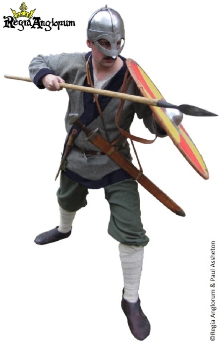 MikeA rich English warrior wearing a Coppergate style helmet and a mail shirt. He is armed with a sword, seax and spear and carries a lenticular shaped shield.