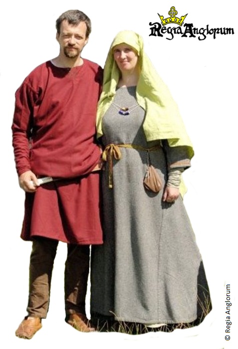 The woman is wearing an open palla whilst the man wears a simple madder dyed tunic and carries a seax.