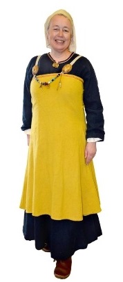 Hair is usually long and braided, left bare or else covered with a small cap or scarf. The dresses are simple, ankle length and with sleeves to the wrist. Neck-holes are either round or oval, and can have a keyhole opening. Decoration usually in the form of facings, narrow silk strips and tablet weave can be applied to the cuffs and around the neck-hole. Vikings don't seem to have favoured embroidery although embroidered panels were imported from other countries. Dresses are usually made from wool but can also be from linen.