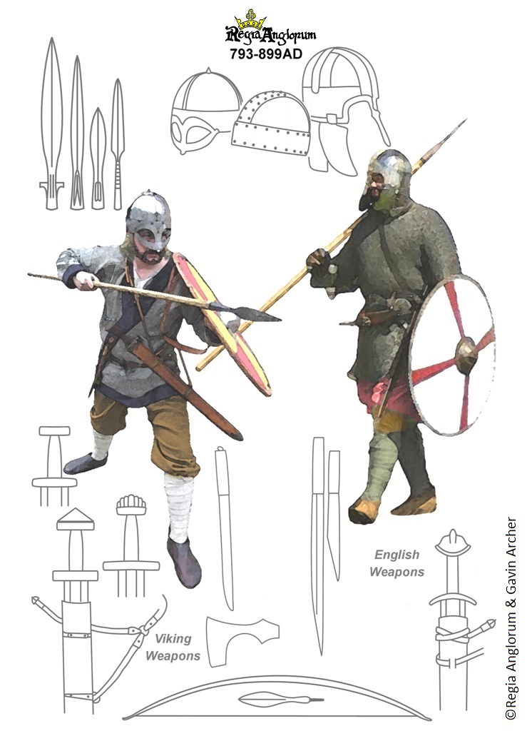 A spear is the primary weapon for all warriors, grasped in one hand and used over-arm. A large wooden round shield is the primary form of defence, faced in leather or cloth and with an iron boss covering the centre grip. Additional weapons could include a seax, a large single edged knife; a hand axe, with or without a beard; a langseax, a 45-60cm long single edged knife; or if they are very lucky, a sword. Swords are incredibly expensive and normally only carried by the rich aristocratic warrior class. The seax was carried by the English, both as a status symbol and as a weapon of last resort.