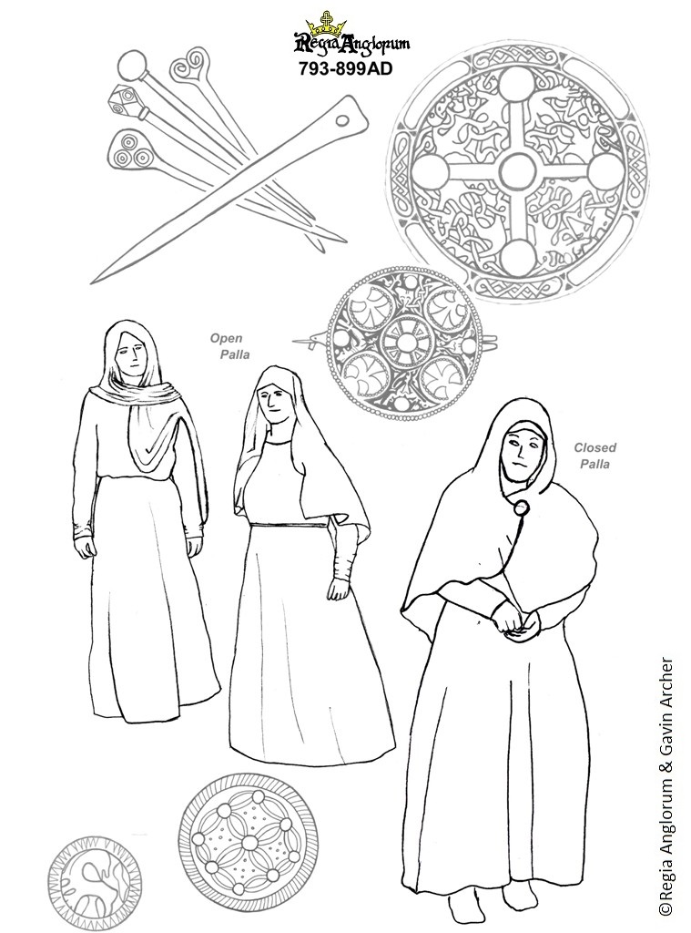 In the 9th century women wear the open palla. This is a large, light-weight rectangle of cloth worn draped over the head and shoulders. It was worn loose and open or else closed, clasped at the chest with a brooch. An alternative head-covering is the simple long scarf type veil, popular in both England and in Carolingian Europe, and worn loosely draped over the head and wrapped around the shoulders whilst leaving the neck showing.