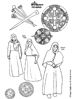 For warmth a cloak can be worn, clasped at the chest by a large disc brooch of silver or copper alloy. Poorer women would close their cloak with ties, a pin of bone, iron or copper-alloy.