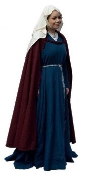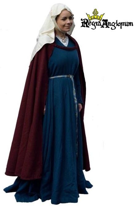 KatGown tight at the body with full skirt and Magyar sleeves and a tablet woven belt. Semi-circular cloak, tied open across the chest. Oval open faced wimple with barbette.
