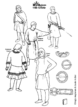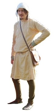 KatUndyed tunic with sleeves tight on the forearm, and small side gores, tight to the leg footed hose and turn shoes or low boots. Leather bag and coif.