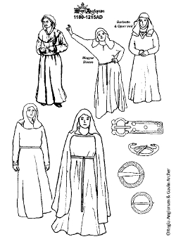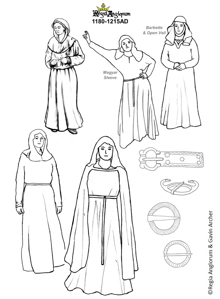 Dresses are very simple, ankle length with sleeves worn close to the wrist. Another popular style is the Magyar sleeve, which is loose at the upper arm with a wide join to the body of the dress creating a 'batwing' effect, and tight to the forearm. Rich women wear dresses with complicated tailoring, a tight bodice and a lot of fabric in the skirt. Most dresses are undecorated and dresses with loose or bliaut style sleeves would have appeared very old fashioned at this time.